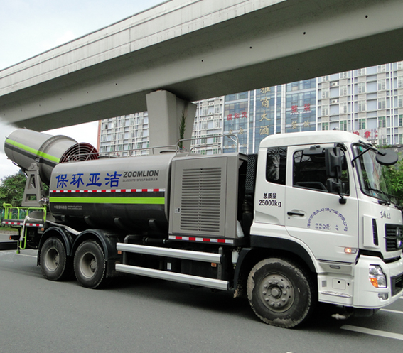 抑尘车上的“大炮”是高压风炮,长约3.25米,主要通过高压泵、高压喷头将水箱里的水雾化,再依靠风炮的风扇将水雾加速喷出,形成大面积的水雾。驾驶员可以根据实际情况调整高压风炮角度,按照设计规格,风炮可以喷射水雾的高度超过45米,远度超过120米。从“雾炮”里喷出的是干净自来水,即使沾到身上也不会有任何污染。